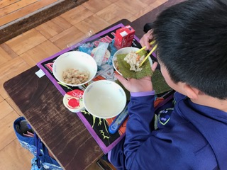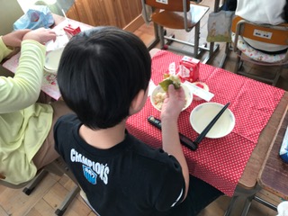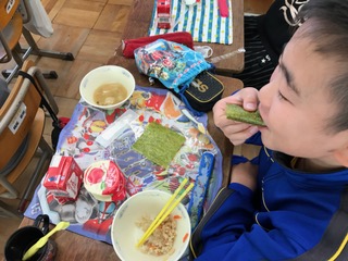 12月15日(金)は台風献立として,炊き込みご飯が出ました。今回はのりもついていたため,みんなで手巻きにして食べました。中には,のりはのりで味わうというこだわりを見せる子もいました。みんなでおいしくいただきました。