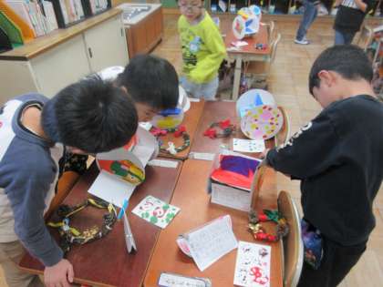 図工科で作った「コロコロゆらりん」の鑑賞をしました。友だちの作品を見て,良いところを見つけます。せっかくなので,あさがおのリースや「うつしたかたちから」で作った年賀状も一緒に見ました。