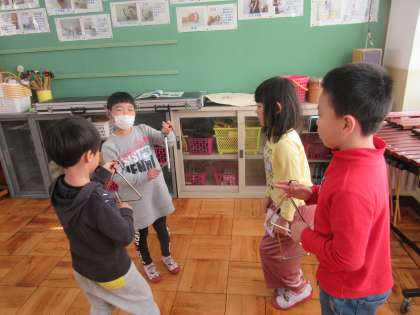合奏は「きらきらぼし」です。鉄琴と鍵盤ハーモニカとオルガンの音色を楽しみながら演奏しました。鉄琴の番が自分に回ってくると,ワクワクして嬉しそうに鍵盤をたたいていました。鍵盤ハーモニカは自信たっぷりにしっかりと演奏していました。
