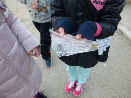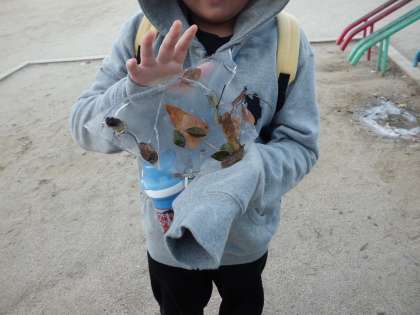 科学センター学習に向けて,朝早く登校してきた5年生の子どもたち。水たまりが凍って氷になっていることに大興奮でした。