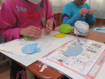 3年生は,図工の学習で紙版画をしています。たくさんある模様のある中からどれがぴったりくるかを選び貼っています。つくりたい生き物のイメージに合わせて版を作っています。