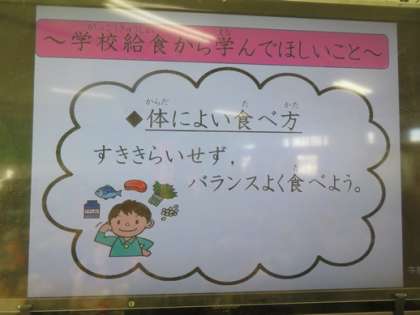 給食室からこんにちはで,学校給食から学んでほしいことが5つ紹介されていました。