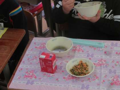 給食にさけとだいこん葉のまぜごはんの具が出てきました。子ども達はその具をご飯に混ぜで食べていました。ご飯に合うおかずでした。