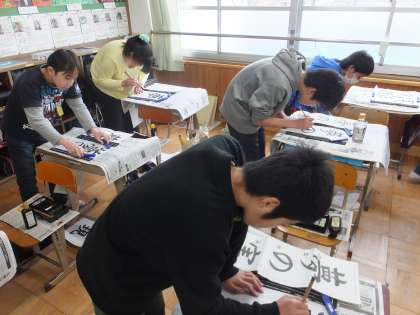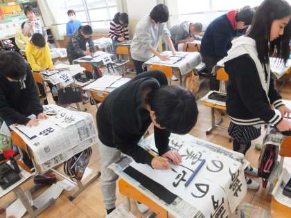 6年生の毛筆の学習で,「夢の実現」を書きました。校内書写展に向けて,自分の夢を思い描きながら集中して書きあげていました。
