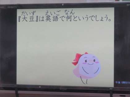 給食に,大豆と鶏肉のトマト煮がでてきました。「給食室からこんにちは」で,大豆を英語で何と言うかクイズが出てきました。正解はsoybeanでした。