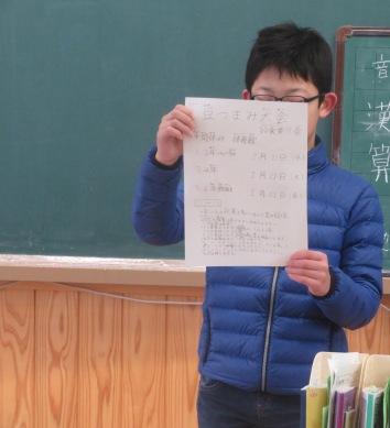 給食委員会のお兄さんが豆つまみ大会のことを伝えに来てくれました。中学年は2月22日に行われます。休み時間に練習をしている姿が見られます。