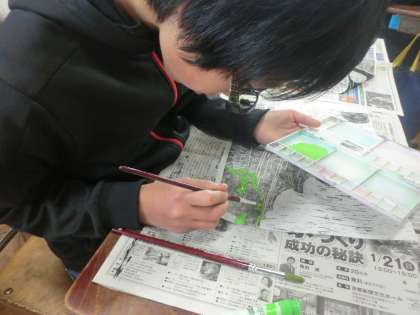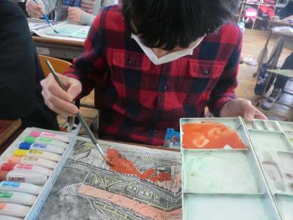 版画紙の裏から,絵の具で色付けをして,作品に