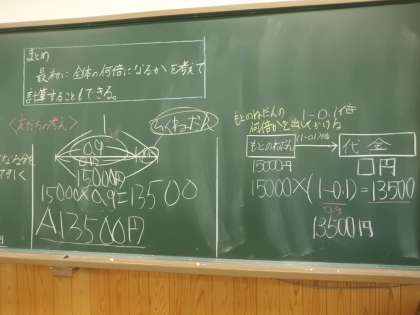 算数科「割合」では,割合が減った時のくらべる量を考えました。1から減った分を引いてからかけることで,簡単に求められることが分かりました。