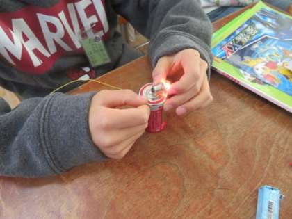 乾電池と1本の導線で豆電球を点灯することができるかを思考錯誤しながら試していました。実験の結果,ソケットがなくでも豆電球に明かりをつけることができました。