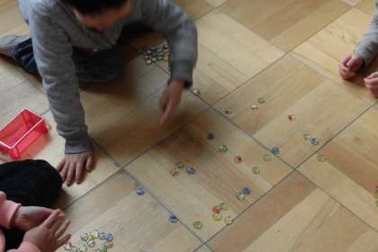 おはじきは,はじく力加減にコツがあるようでした。友達とおはじきを囲み,ねらいを定め真剣にはじいていました。