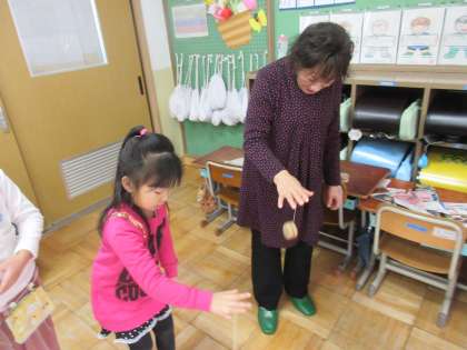 「ヨーヨー」は,下に降ろして引き上げるタイミングが難しく,何度も挑戦していました。タイミングをつかんで,上に上がってくるようになると,今度はヨーヨーをしっかりつかもうと頑張っていました。できるようになると,それが嬉しくて「見て!」と満面の笑みで女性会の方に見てもらっていました。