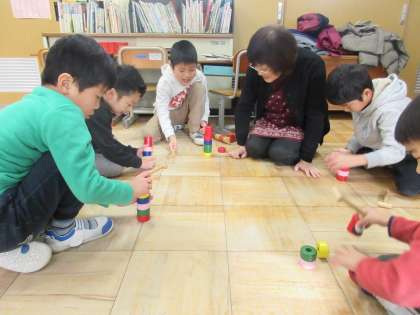 「だるまおとし」は,夢中になりすぎて,積み木を激しく飛ばし拾いにいくのが大変そうでした。だんだんとコツをつかむと,だるまが倒れずに残るのが爽快な様子でした。