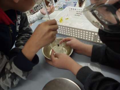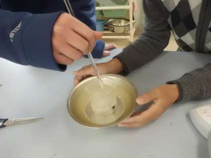 理科「もののとけ方」では,残ったホウ酸を溶かす方法を考えました。温めれば溶ける量が増えると考えた子どもたち。温めながら溶ける様子を確かめていきました。