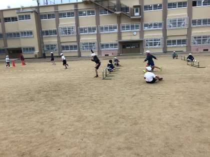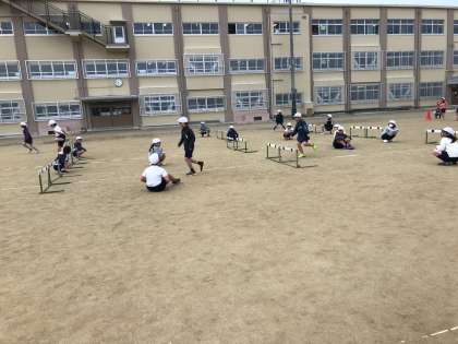 初めてハードル走にチャレンジしました。3台のハードルをリズムよく跳びこしながら走るめあてで今日は学習しました。3歩のリズムを意識してがんばりました。準備や声かけもグループで協力して学習することができました。