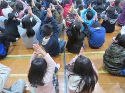 朝会で黒田先生から音楽のお話を聞きました。先生の合図に合わせて拍手をしたり,音楽に合わせて動いたりしました。アイスクリーム,チーズケーキ,シュークリーム,それぞれのポーズを楽しみながら動いていました。教室に帰ってからも自分たちで言い合いながらポーズをしていました。