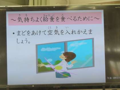 「給食室からこんにちは」で,気持ちよく給食を食べるためにというお話がありました。例えは,机の上を片付ける,窓をあけて空気を入れかえる,配膳台をきれいにふく等が紹介されていました。気持ちよく給食を食べるためにできることを頑張っています。
