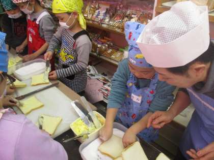 パンのいいにおいが立ち込める中,みんなでバターを塗って,砂糖をつけて,ラスクを作りました。