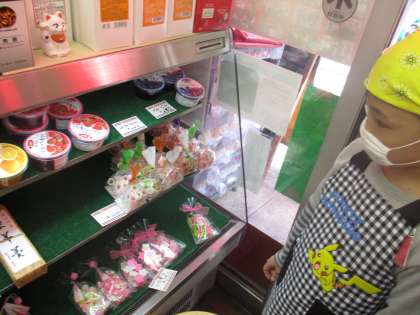 まめしげさんには,ひな祭りのお菓子が置いてありました。町たんけんで,季節に合わせて,商品が変わっていることを学習したので,「これは,もうすぐひな祭りだからだね」「三色ゼリーに似ているね」と言っていました。