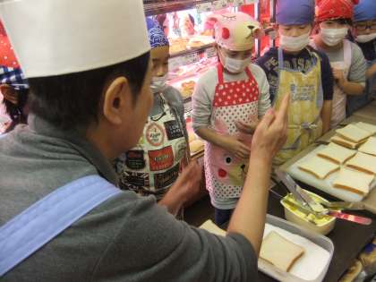 パン屋さんに着いて,挨拶のあと早速ラスクの作り方を教えていただきました。「マーガリンをすみずみまでつけるんだよ。」「グラニュー糖をマーガリンの方に付けてね。」優しく声をかけてもらいながら,みんな一生懸命作業をしていました。