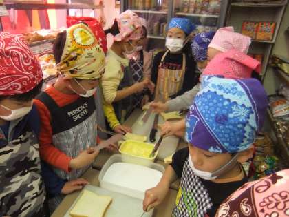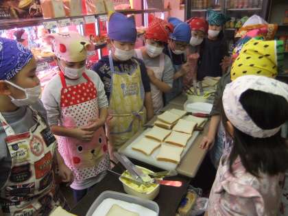 「マーガリンの塗り方はこれでいい?」「包丁で切るの怖いな〜」と言いながら,みんな喜んで活動できました。「なんか作るの楽しい。」みんな笑顔でした。