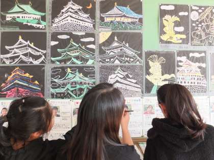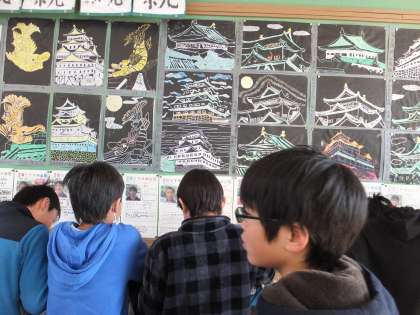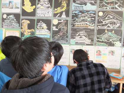 名古屋城をテーマに制作した版画の鑑賞を行いました。「しゃちほこのうろこの細かいところまで彫れていていい」「石垣の雰囲気を出す彫り方ができている」など,友だちの作品の良さを出し合い,交流することができていました。