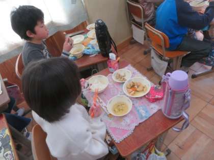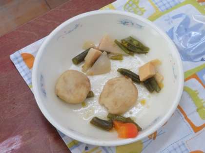2月の和献立に白天の煮つけが出てきました。白天は白い平天です。和食ではいろどりを大切にしていて,今回は人参,たけのこ,三度豆といっしょに煮つけ,白天の色がきれいに見えるようにされていました。