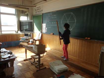 算数科「円と正多角形」では,コンパスで描いた円のまわりを,半径分開いたコンパスで区切っていきました。次にその点を定規でつないでいくと,なんと正六角形が完成!なぜ正六角形になるのか,そのわけを考えました。