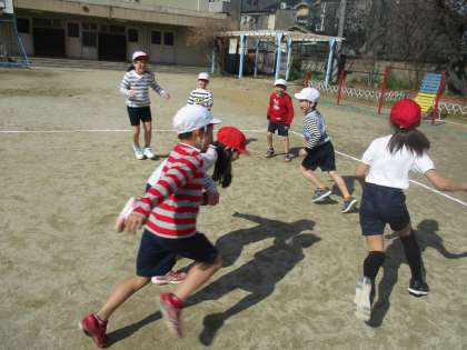 しっぽとりや色おに,ふえおになどいろいろな種類のおにごっこをしたり,力強く相手を押したり,ひっぱたりしながら,すもうあそびを楽しんだりしています。