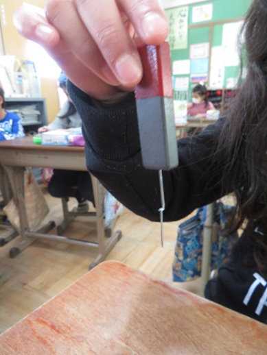 磁石に付いた鉄釘が,磁石になっているか調べました。磁石に付いた鉄釘に,鉄釘が付くことを確かめました。その次は砂鉄が付くか調べました。