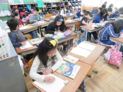 6年生徒のお別れ集会がありました。3年生は縦割りグループでお世話になった6年生の似顔絵をかきました。子ども達は絵を書きながらこれまでの思い出を振り返っていました。