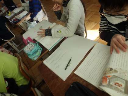 国語科では「わらぐつの中の神様」のお話を使って,物語の特色をつかむという学習をしています。まずは,登場人物の人がらをもとに特色をまとめました。今までの学習を生かし,人柄が分かる記述を見つけていきました。