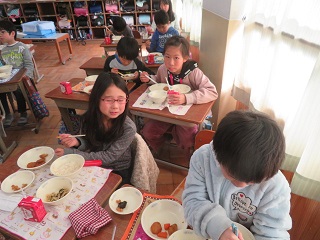 給食に小松菜と切干大根の煮びたしが出てきました。切干大根は,干すことでより一層甘くなり,香りもよくなります。骨や歯をつくるカルシウムや血を作る鉄が多く含まれています。