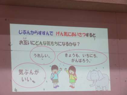 朝会で3月の生活目標にかかわる話がありました。3月の生活目標は,「じぶんからすすんでげん気にあいさつするぞう」です。自分からすすんであいさつをするとお互いにどんな気持ちになるかな?