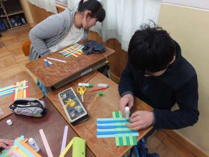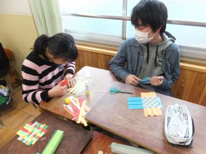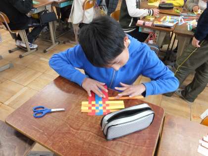 図画工作科の学習で,「アミアミアミーゴ」に取り組みました。画用紙を交互に編んでいって,コースターづくりをしました。どんな色で編んでいくかを一人一人が考えながら制作していました。