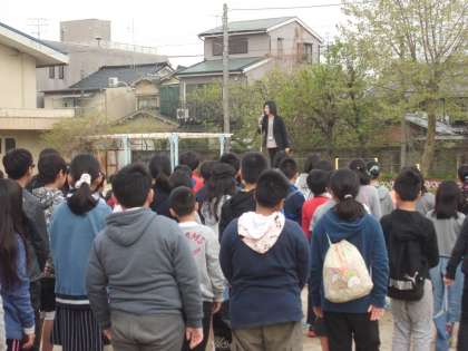 始業式の校長先生のお話を静かに聞く子どもたち。その後の担任では,発表のたびに,子どもたちから歓声があがりました。