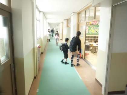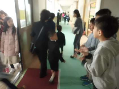 入学式の受付を済ませた1年生を教室までご案内。廊下では拍手とおめでとうの言葉がけ。さすが6年生です。