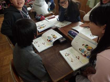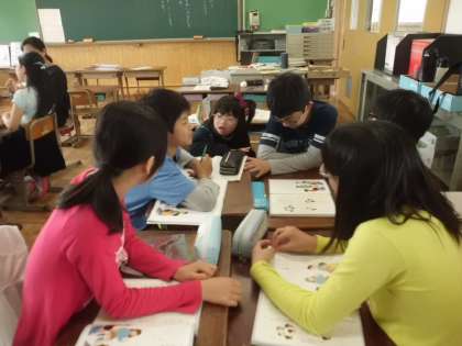 国語科「言葉の準備運動」では,グループで話をつないで,一つのお話を作ることに挑戦。最初と最後の一文を決め,グループで2周する間に一人目から順番に一文をつないでお話を作りました。途中で思いがけないような展開が広げられても,グループで協力し,お話を作り上げることができました。