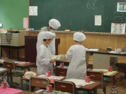 今日は自前のエプロンを持ってきた子たちが1年生の給食のお手伝いを。1年生と協力して上手に進めていくことができました。