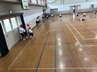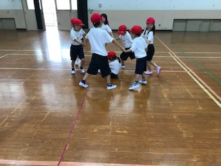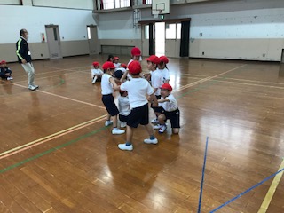 体育では,仲間と楽しく体を動かして遊びました。二人組になって「なべなべそこぬけ」やストレッチ,少し大勢になって「だるまさんがころんだ」や「かごめかごめ」などをしました。少しずつ友達同士でかかわって楽しむ姿が見られるようになりました。