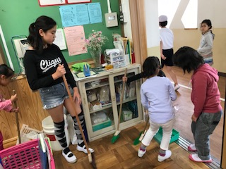 1年生の教室に6年生が給食の時間や掃除の時間にたくさんお手伝いに来てくれます。ほうきの使い方や雑巾のかけ方を6年生は丁寧に教えてくれます。1年生は6年生が教えてくれることをよく聞き,真似をして頑張っています。掃き掃除も隅々まですることを教えてもらいました。