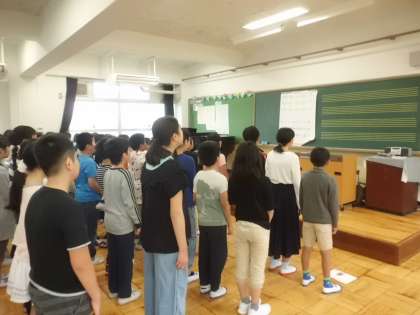 1年生を迎える会に向けて,歌声でお手本を見せようと意気込む子どもたち。高井先生と発声練習をする中で,きれいな歌声が出るようになりました。