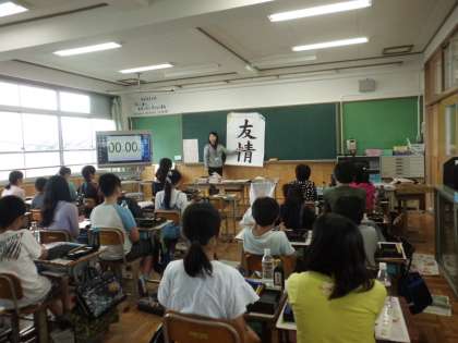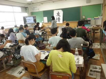 書写の学習では,増木先生と一緒に「友情」の字に挑戦しました。筆使いや字形で気をつけるポイントを教わった子どもたち。それらを意識して,練習に励みました。練習中は,よい姿勢で静かに書き進めていくことができていました。