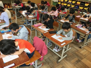 今日のひらがなは12個目になりました。「ん」です。口をしっかり閉じて音を出します。「ん」は,1画しかありませんが,曲がるところや曲げ方が1年生の子どもにとってはとても難しいです。何度も確認しながら慎重に書いていました。「ん」のつく言葉もたくさん見つけられました。「ん」のつく言葉,おうちでも見つけられたかな。
