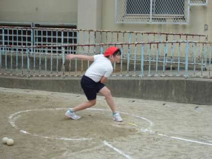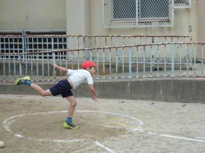 ボールを遠くに投げられるように思い切って腕を振りぬきました。