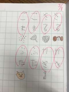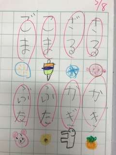 ノートをそろそろ使い始めることになった1年生です。習っていないひらがなもありますので,ゆっくり書きました。「かき・かぎ」「こま・ごま」など,濁音の「〃」をどこにつけるといいのかな,一緒に読みながらノートに書きました。「〃」をつけるだけで,全然違う言葉になるんだなぁ,と思ったようで空いているところに挿絵を描きました。