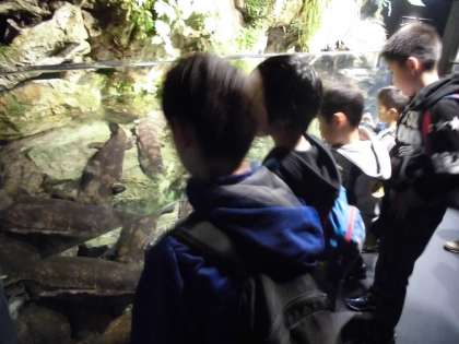 京都水族館では,天然記念物のオオサンショウウオの姿に驚き,アシカやアザラシが水の中を泳ぐ様子に見とれ,イルカショーではイルカたちの芸当やジャンプに拍手を送りました。