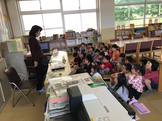 今日は図書室に行き,本の借り方・返し方,読みたい本の置かれている場所などを図書室の先生に教えてもらいました。図書室にはたくさんの楽しそうな本がありましたね。しっかりお話が聞けた後は,図書室の先生がみんなに楽しい絵本を2冊読んでくださいました。楽しいお話にこれからもたくさん出会えるといいね。