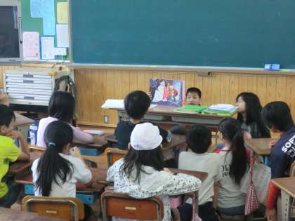 本係のみなさんが朝の帯時間に紙芝居の読み聞かせを