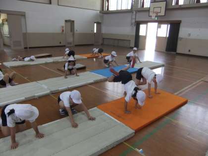 体育科で「マットあそび」の学習をしています。川とびやロバキックをして,足を高く上げる練習をしています。子ども達は,マットあそびが大好きです。前回りや後ろ回りも練習しました。