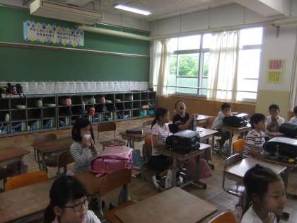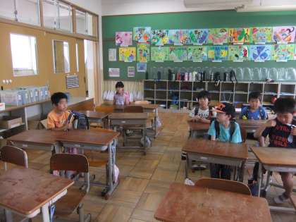 警報発令の際の緊急下校の訓練をしました。学校待機児童は体育館まで静かに移動することができました。町別で下校する児童も,放送を聞いて静かに待つことができました。
